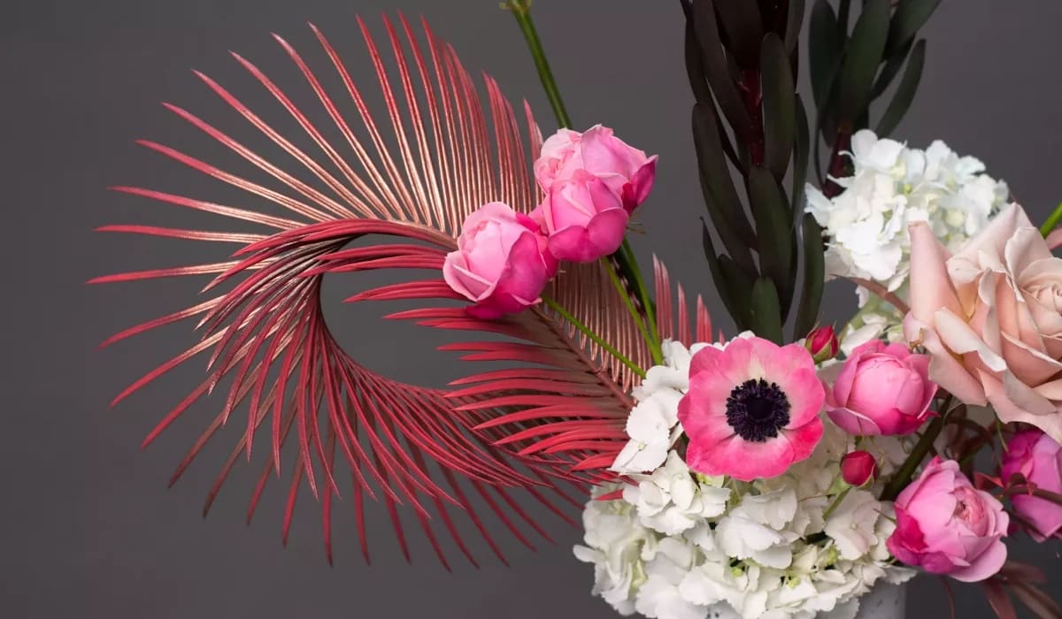The Saturday Night Fever bouquet is what you get when you leave floral designers in the back room and tell them that they can do what they want. This thing is just too much fun. A mix of gentle copper, pink, and whites betrays the raw charisma of this beautiful arrangement. A dramatic front-facing profile looks like a flower bomb going off and disco balls bring the bling to this retro beauty. This is a great option for your Galentine’s gift, or if you’re hosting your own personal kitchen dance party this year.